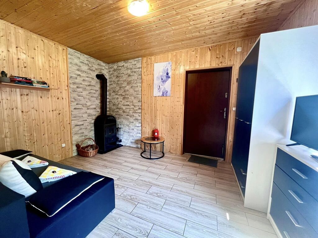 Domek 2: 22 m², również z pełnym wyposażeniem i kominkiem. Mała, ale przytulna przestrzeń, doskonała na wypoczynek.