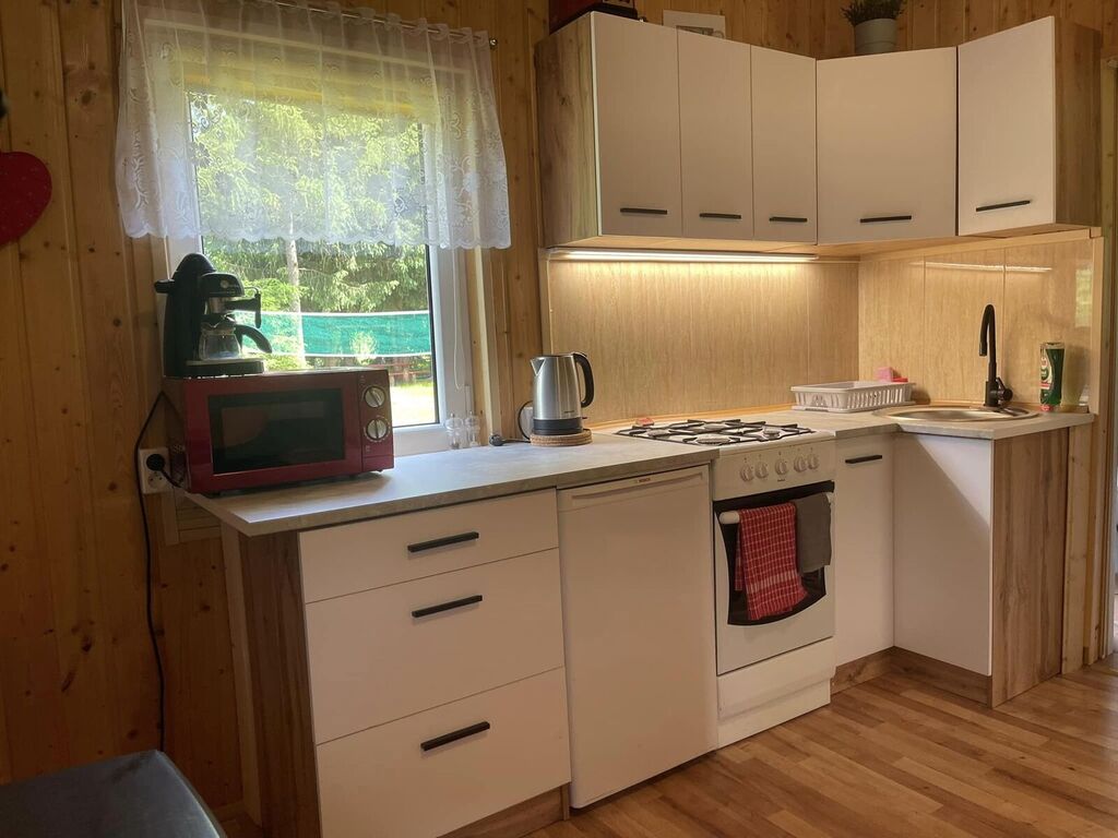 3 domek drewniany: 48 m², przestronny, z łazienką, kuchnią i ogrzewaniem kominkowym, całoroczny.