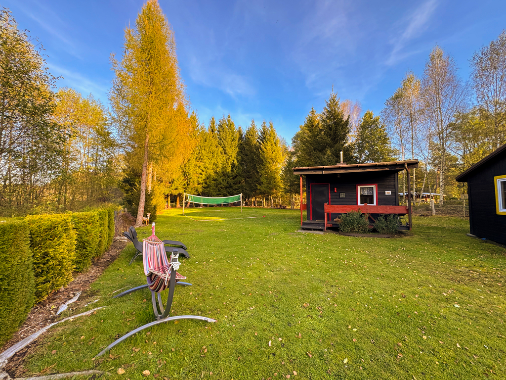 Domek 1: Ocieplony, 35 m², całoroczny, z kominkowym ogrzewaniem, łazienką, kuchnią, dostępem do prądu i wody. Idealny na zimowe wypady.