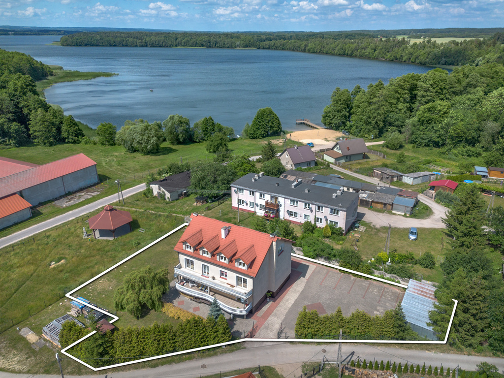 Budynek wolnostojący, konstrukcja budynku tradycyjna, murowany, beton komórkowy, wybudowany 2007 r. Budynek od początku pełnił funkcję wynajmu pokoi od 2009- 2018 r. Budynek ocieplony styropianem 10cm. Dach pokryty blachodachówką. Okna PCV, natomiast w 2023 wymienione drzwi balkonowa na nowe trzyszybowe. Dom posiada instalację elektryczną, CO i wodną, kanalizacja miejska. Instalacja miedziana(jedno i trójfazowa). Budynek posiada piękne duże 3 balkony z dwóch stron z widokiem na ogród i jezioro. Pomieszczenia w nieruchomości ogrzewane są piecem nowym na pelet. Na działce znajdują się trzy garaże blaszane. Działka jest zadbana, zieleń i drzewka ozdobne. Na działce znajduje się również duży parking z kostki brukowej. Dojazd do budynku zapewnia asfaltowa droga. Ogrodzenie wokół posesji zapewnia zarówno bezpieczeństwo, jak i poczucie prywatności.