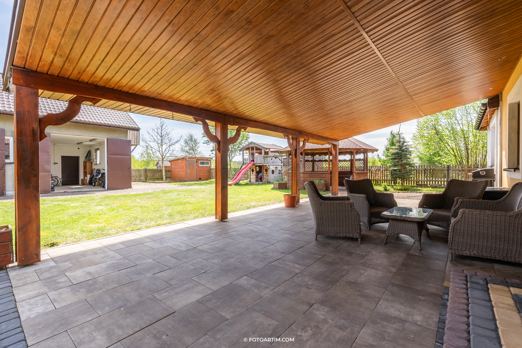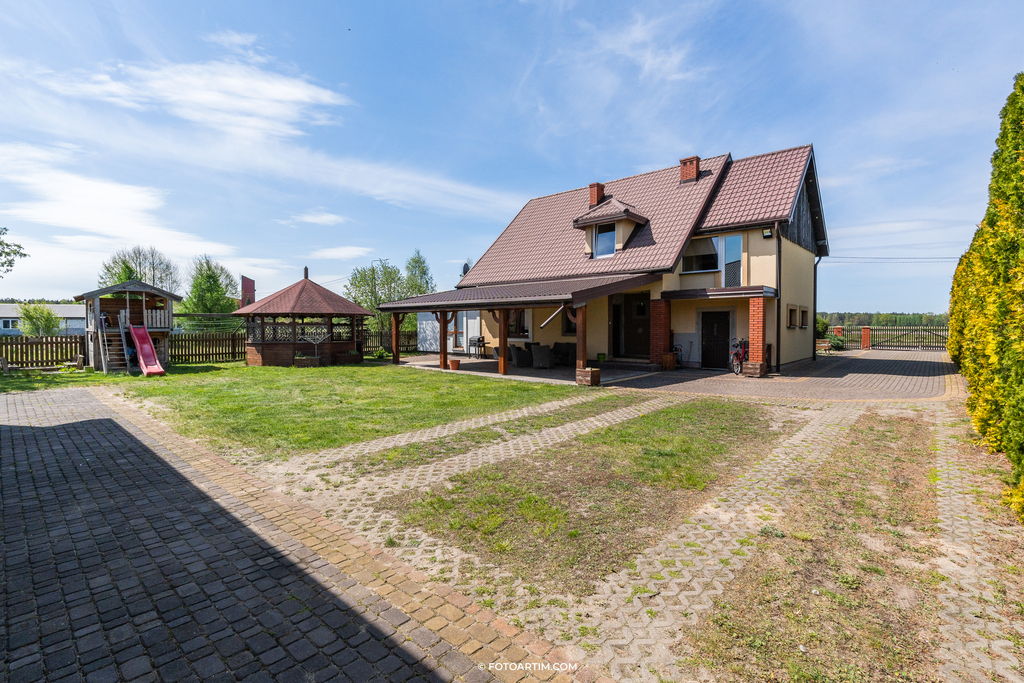 Na posesji znajduje się zadaszony taras oraz podjazd wyłożony kostką brukową.