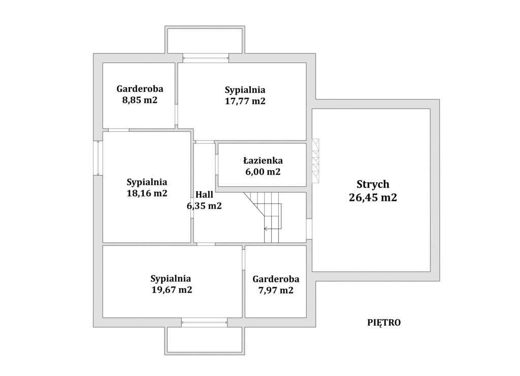 Piętro pozostaje w stanie surowym do własnej aranżacji. Bez tynków na ścianach.