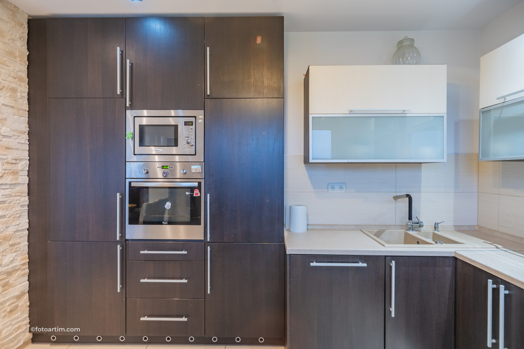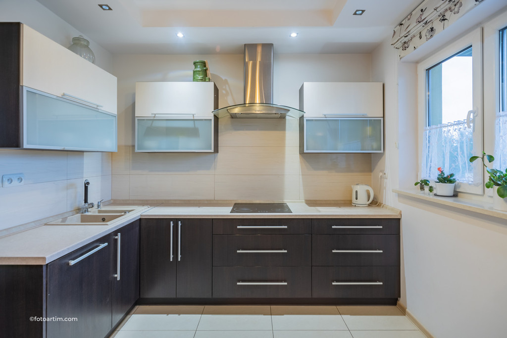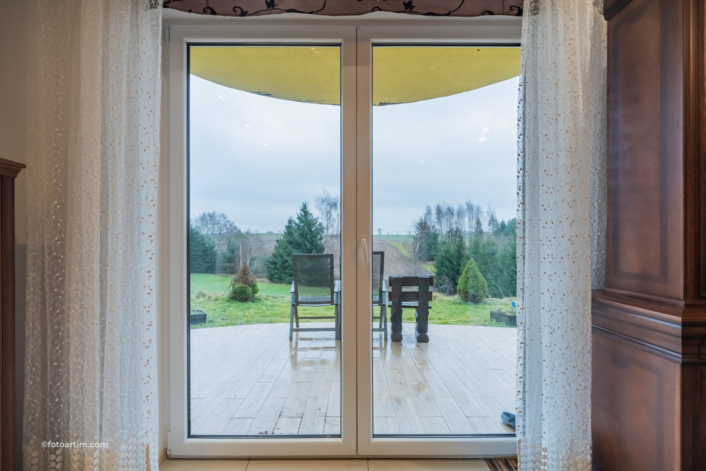 > Kuchnia połączona z salonem oraz wyjściem na taras