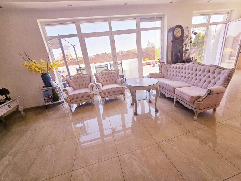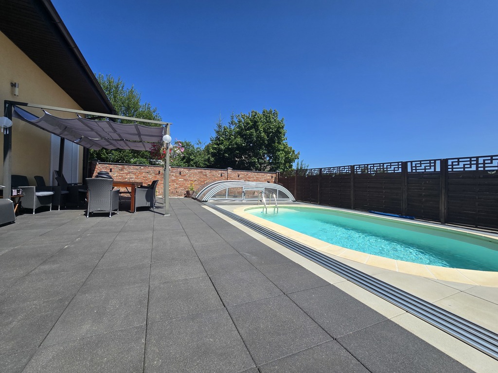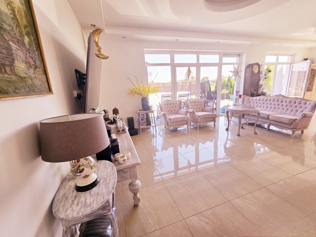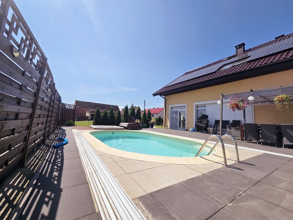- zjawiskowy salon 43,82 m2 z dużymi przeszkleniami osłonięty z zewnątrz roletami zewnętrznymi wyjściem na słoneczny taras 60m2 oraz odkryty basen 80 m2