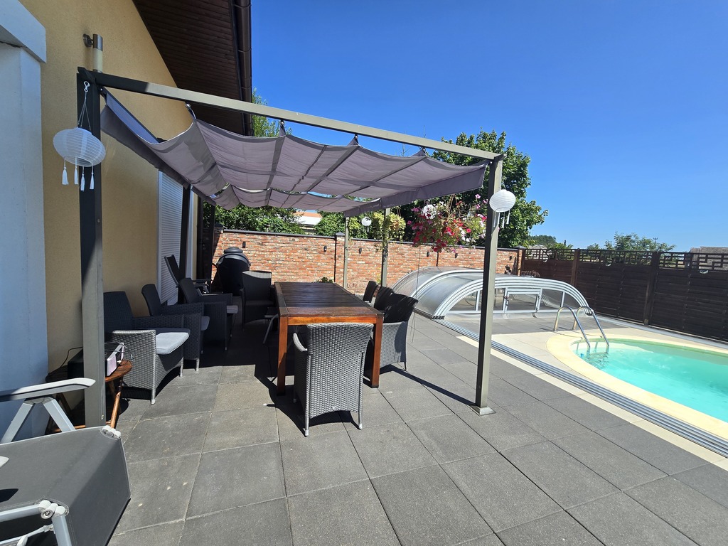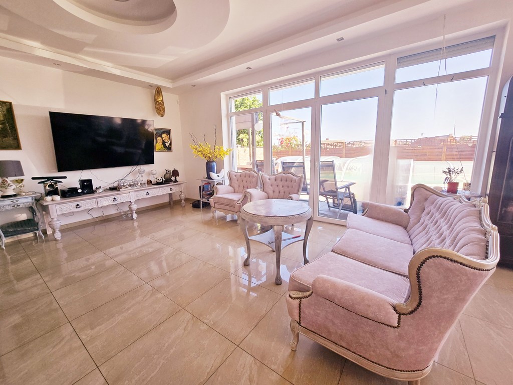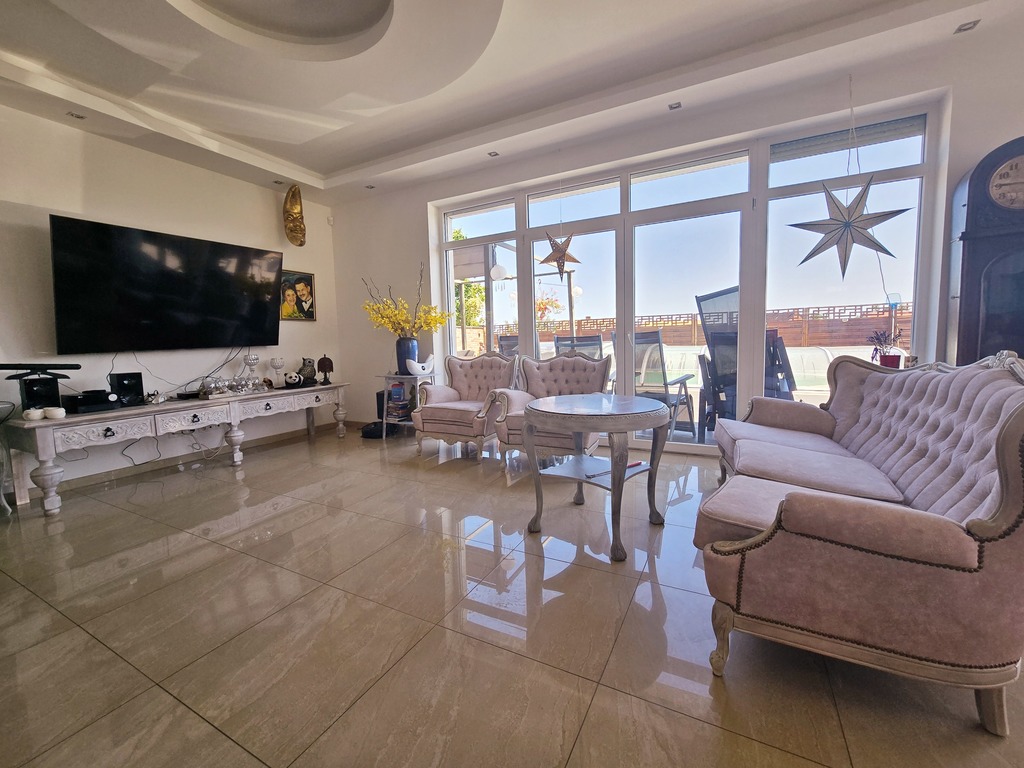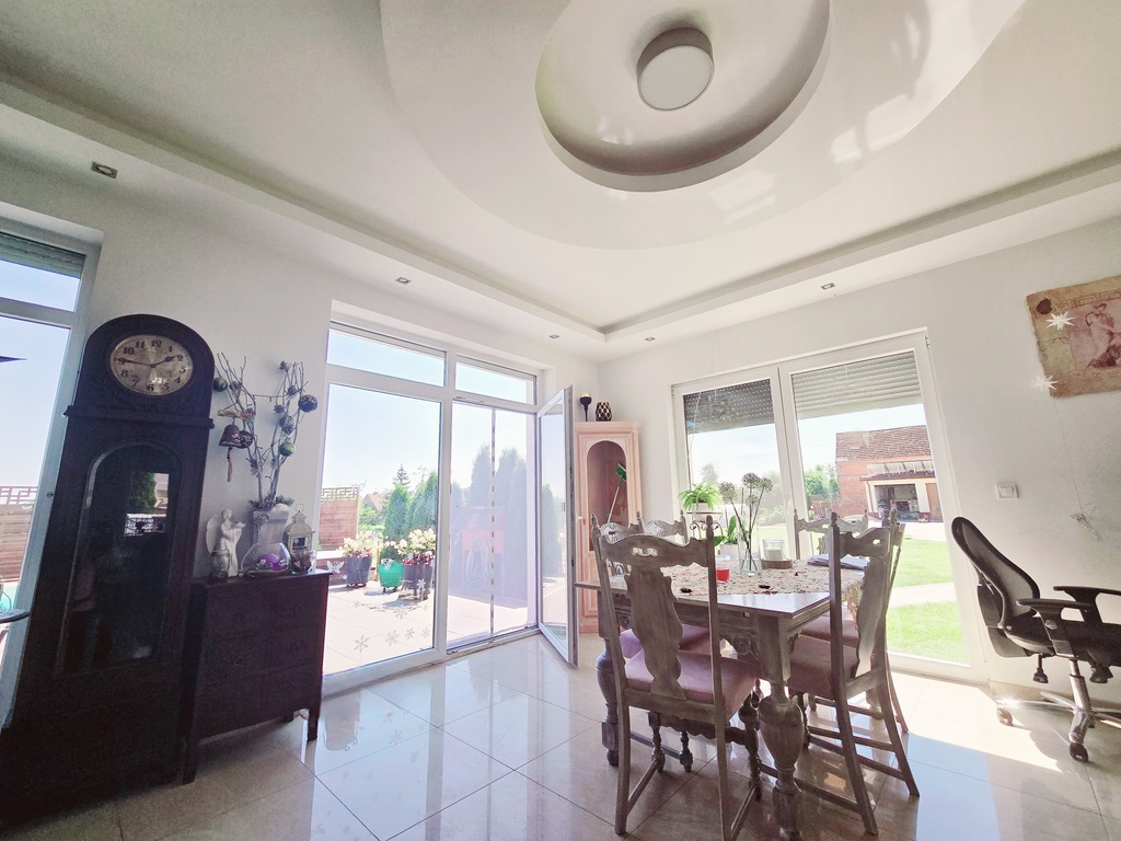 - zjawiskowy salon 43,82 m2 z dużymi przeszkleniami osłonięty z zewnątrz roletami zewnętrznymi wyjściem na słoneczny taras 60m2 oraz odkryty basen 80 m2