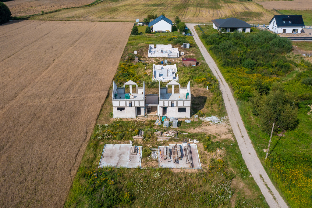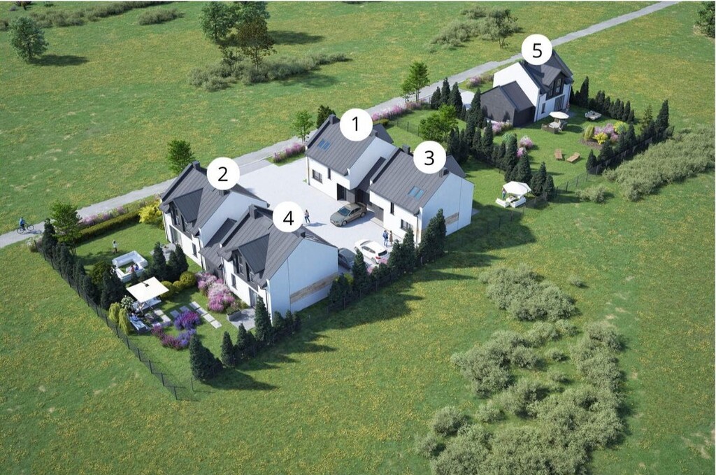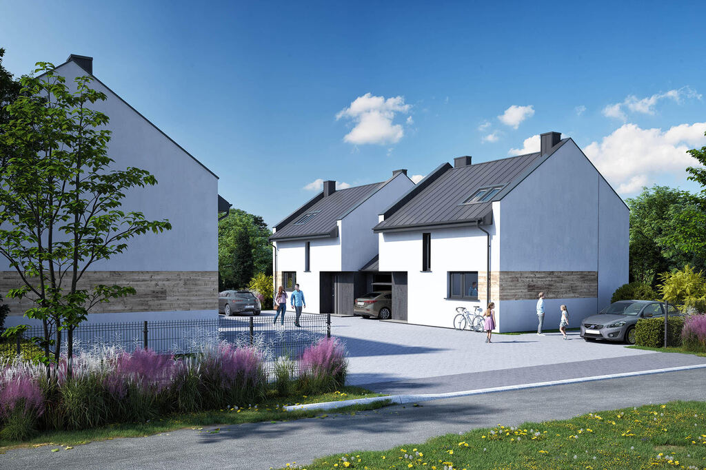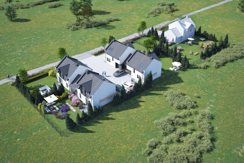 Domy są sprzedawane w stanie deweloperskim z zamontowaną pompą ciepła, kostką brukową na podjazdach i chodnikach oraz ogrodzeniem.