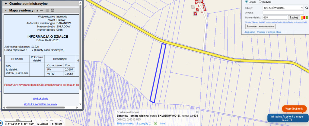 Oferuję na sprzedaż działkę rolną położoną w miejscowości Składów, w gminie Baranów, powiat Puławy, województwo lubelskie.