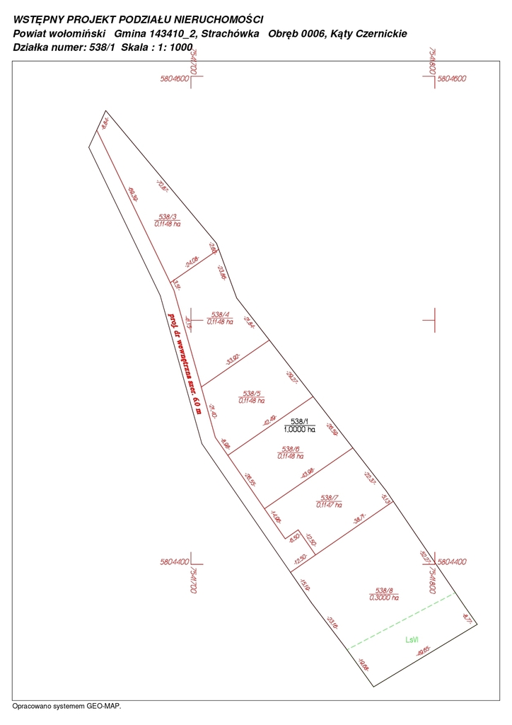 Teren pochodzi z działki macierzystej nr 538/1, obręb 0006 Kąty Czernickie. Wszystkie działki mają regularny kształt, zapewniający swobodę w projektowaniu budynku.
