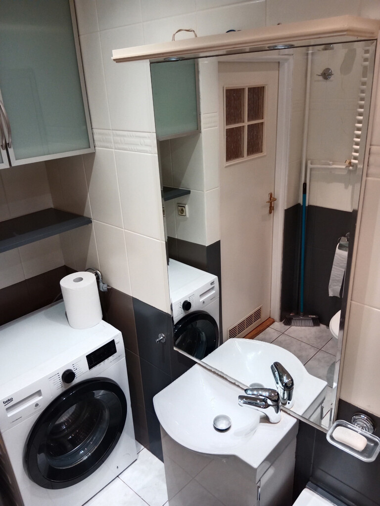 ***łazienka z pralką i wanną oraz  WC