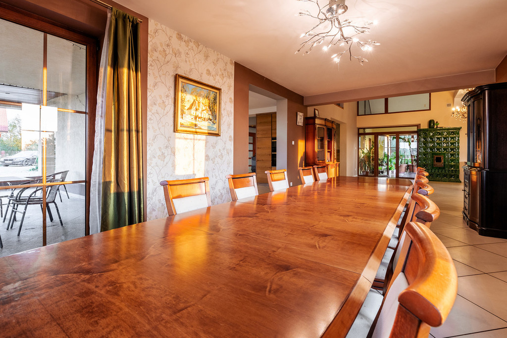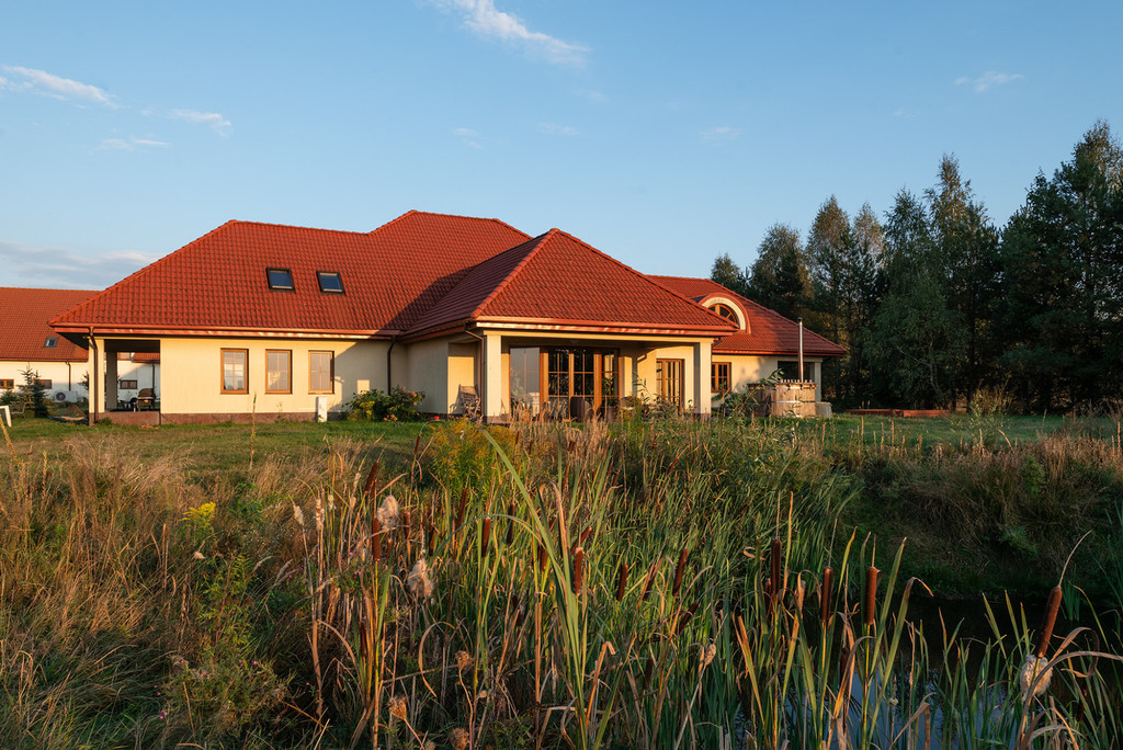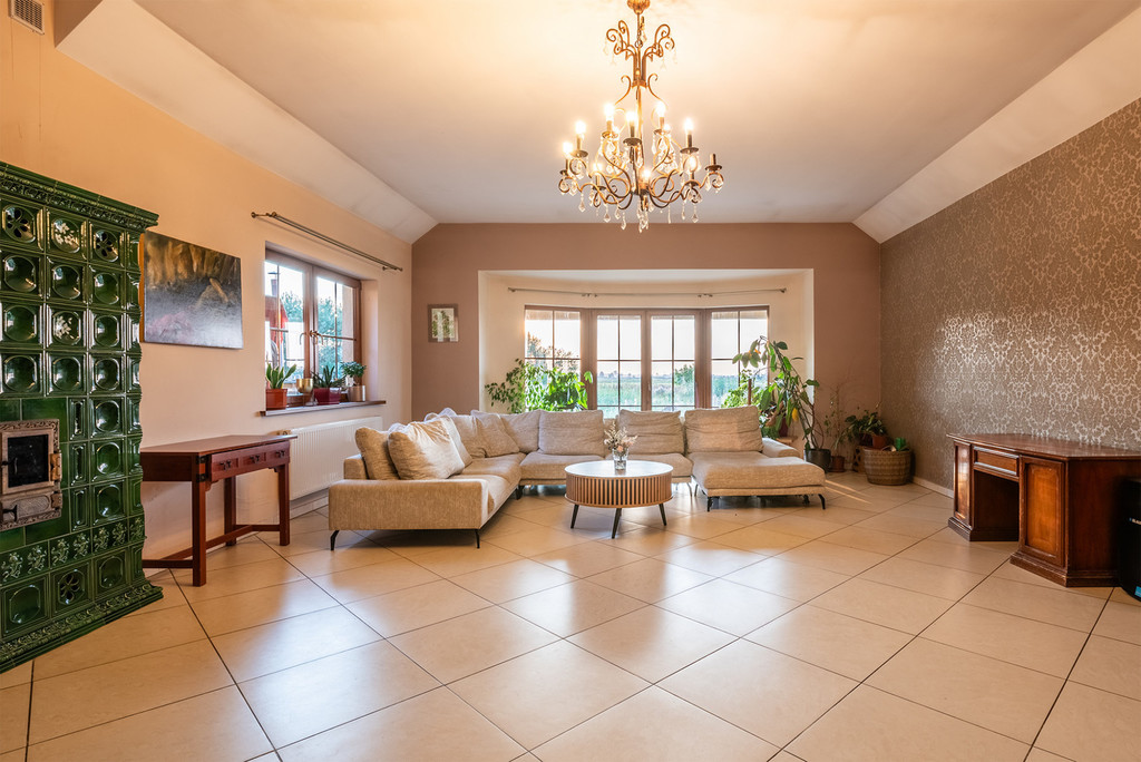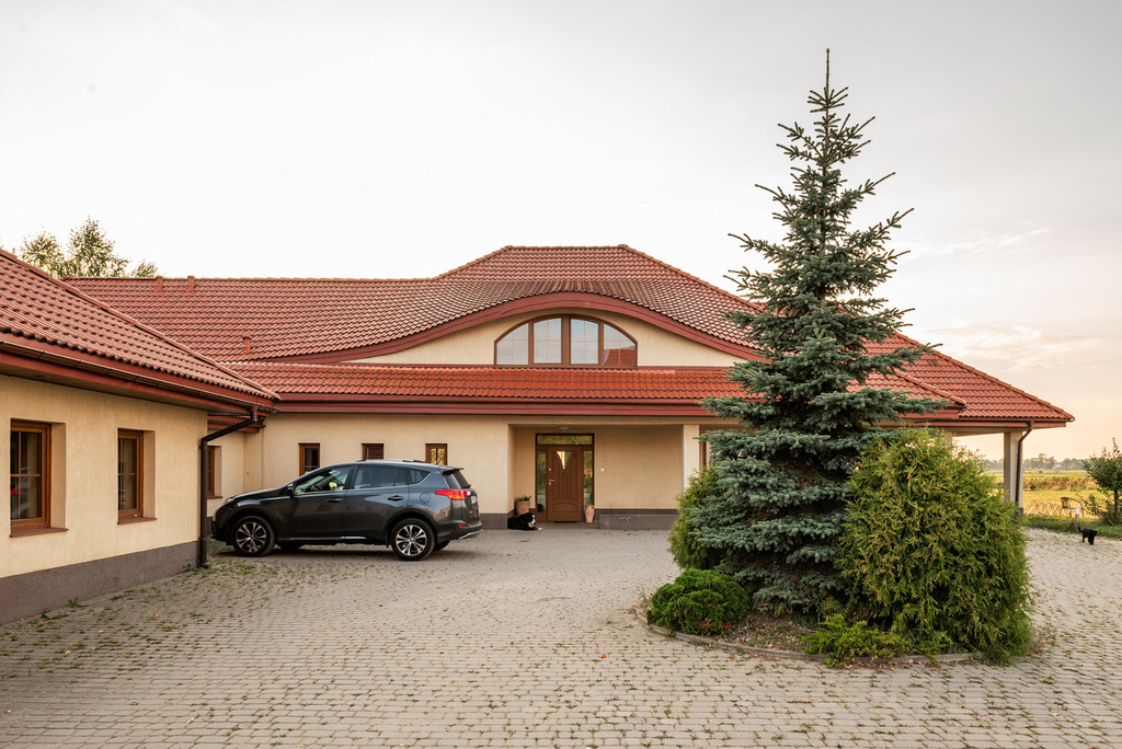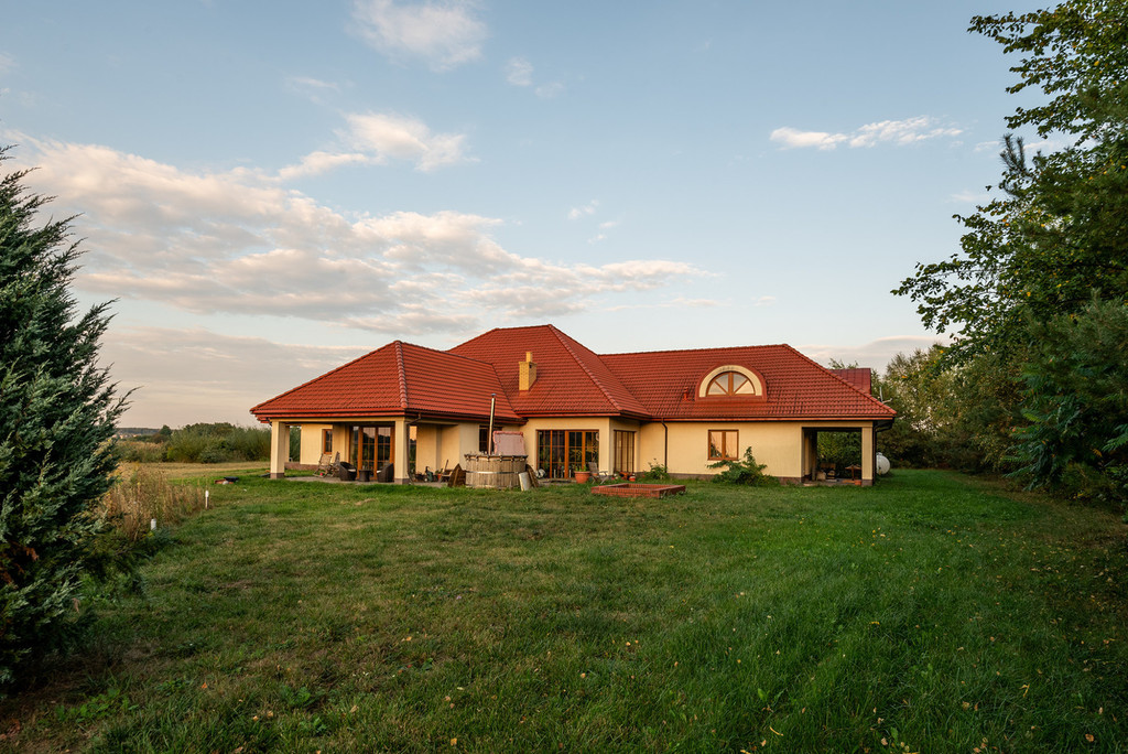 Duża działka o powierzchni 0,9950 ha, w regularnym kształcie, na której posadowiony jest wolnostojący, parterowy budynek mieszkalny z poddaszem użytkowym i dwustanowiskowym garażem w bryle budynku o powierzchni użytkowej 438,34 m2