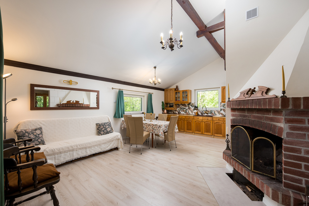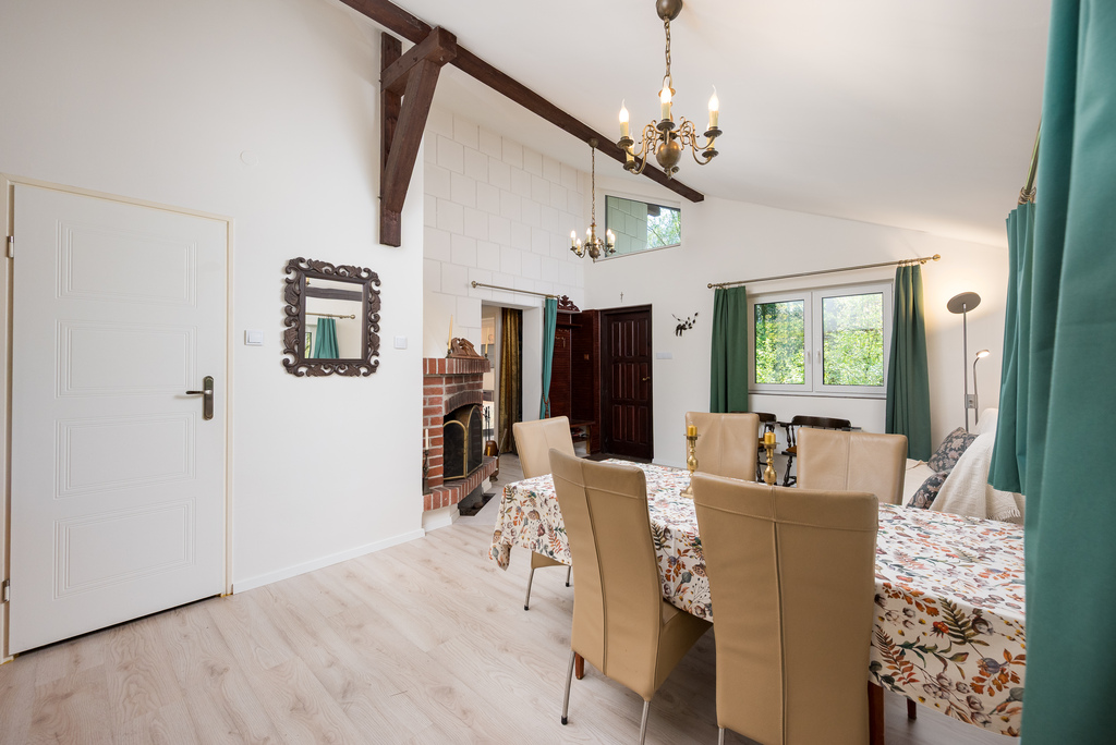 v Ogrzewanie: elektryczne (grzejniki + podłogowe) oraz duży kominek – komfort przez cały rok