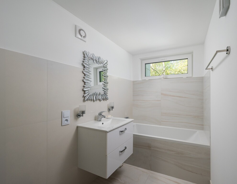 Łazienka – jasna, nowoczesna, z wanną i elegancką ceramiką (duże kafle design Zień)