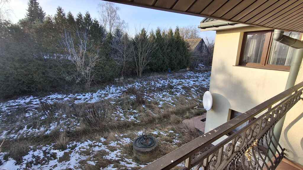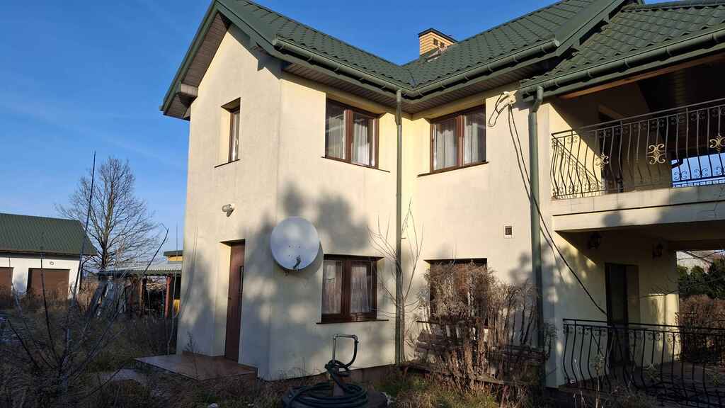Działka zabudowana jest domem mieszkalnym po rozbudowie, budynkiem garażowym czterostanowiskowym oraz wiatami drewnianymi.