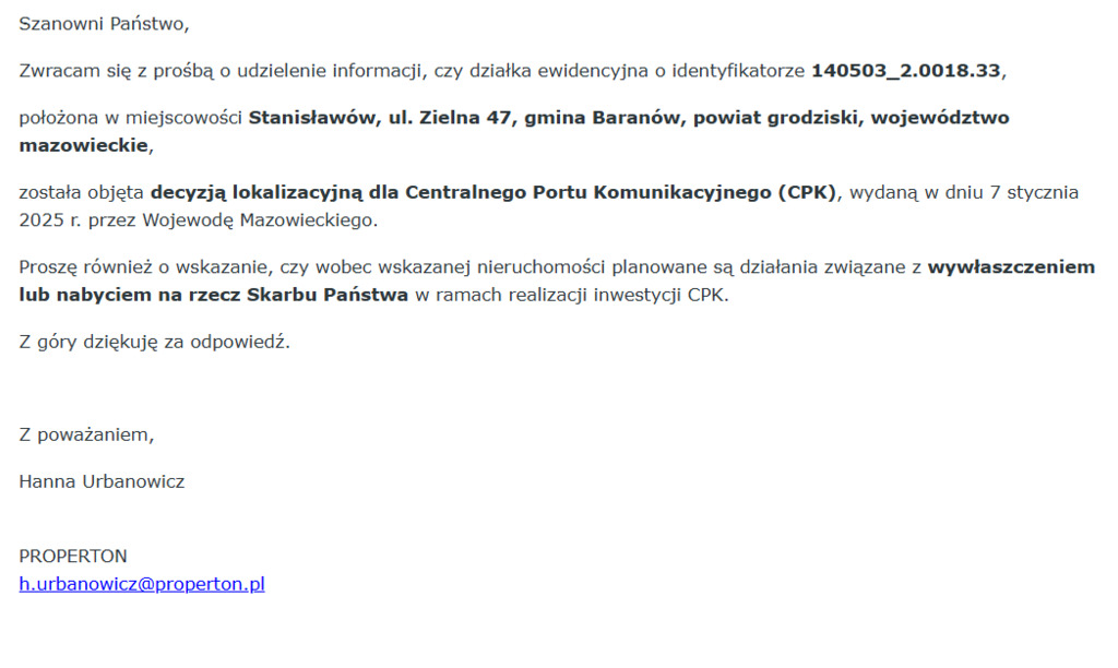 W sekcji zdjęcia odpowiedź na zapytanie w sprawie decyzji lokalizacyjnej dla Centralnego Portu Komunikacyjnego (CPK).