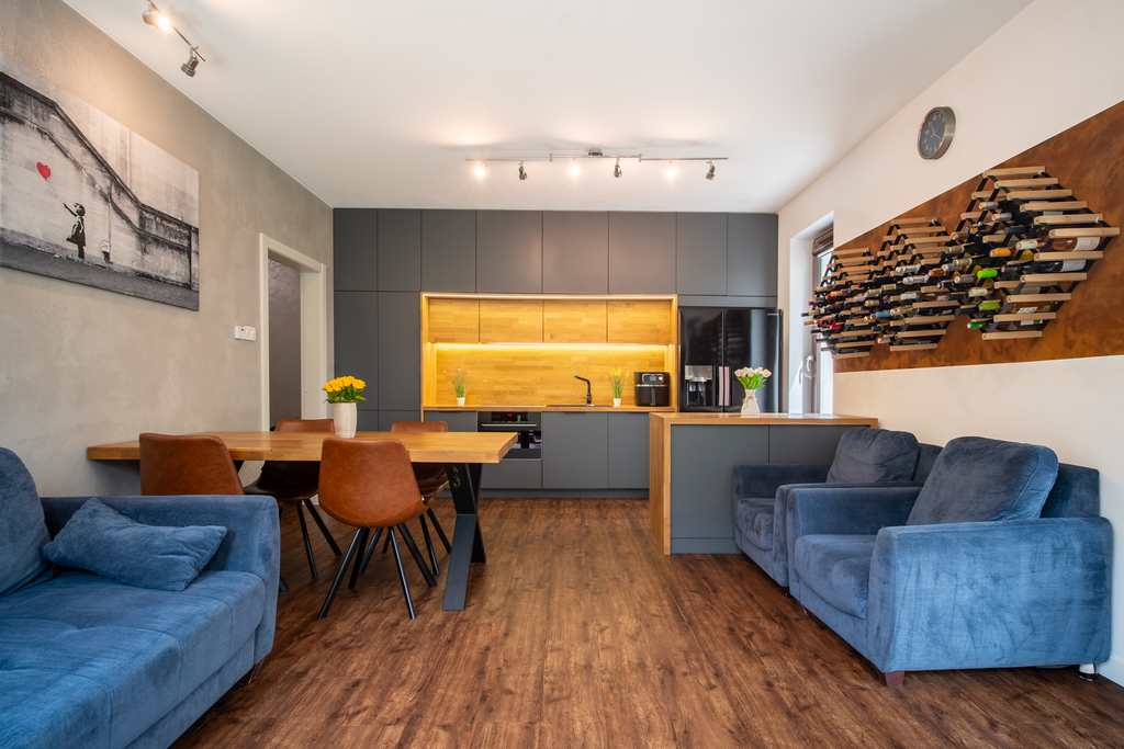 Kuchnia jest w pełni wyposażona w meble wysokiej jakości i sprzęt AGD.