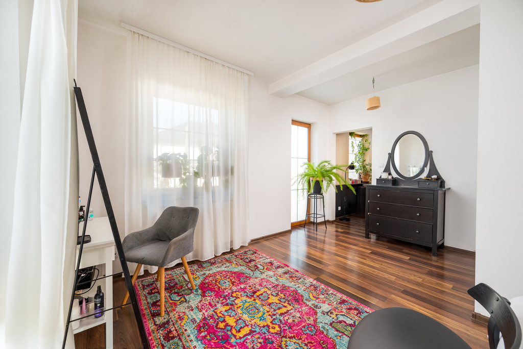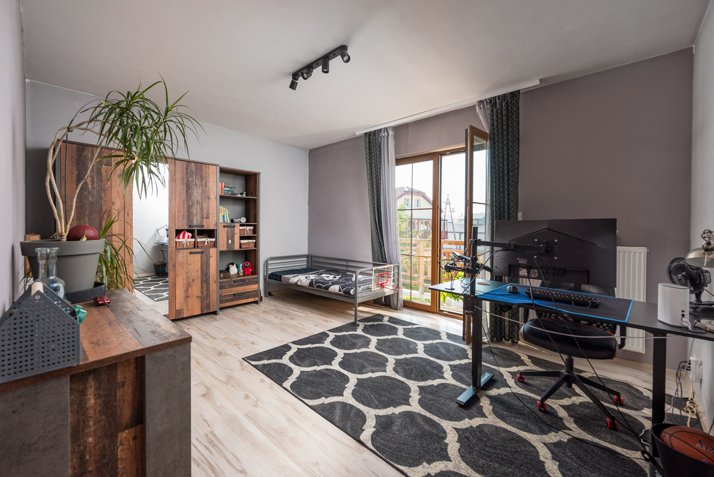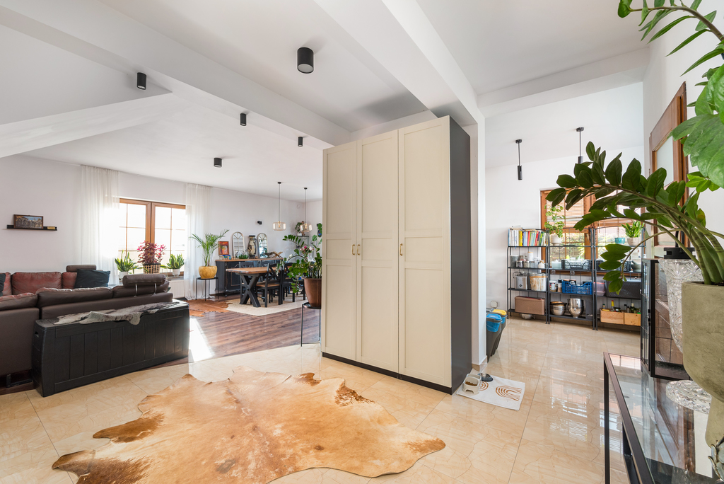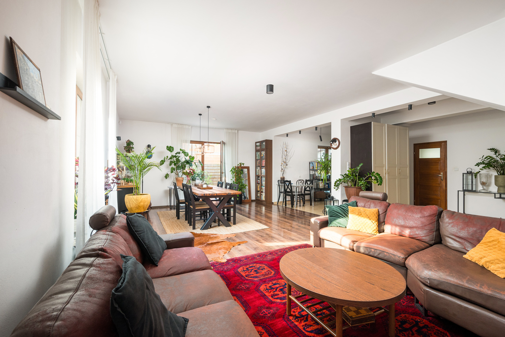 Na parterze znajduje się strefa dzienna z wschodnio - południowo - zachodnia ekspozycją, która oferuje przestronny salon z dużą wygodną kanapą.