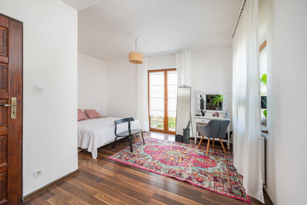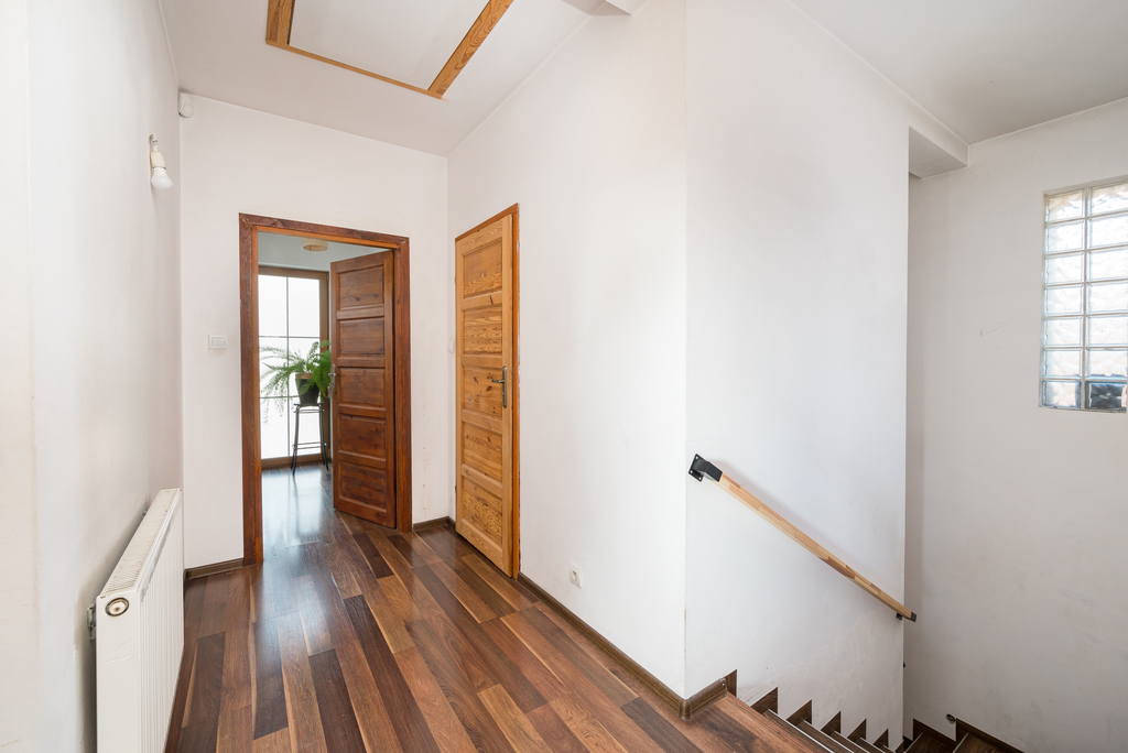 Z holu na piętro prowadzą drewniane schody. Na piętrze znajdziemy sypialnie główną z garderobą i wyjściem na balkon, dużą łazienkę z prysznicem i wanną w całości wyłożona granitem. Dodatkowo dwie sypialnie w tym jedną również posiadającą wyjście na balkon z widokiem na ogród.